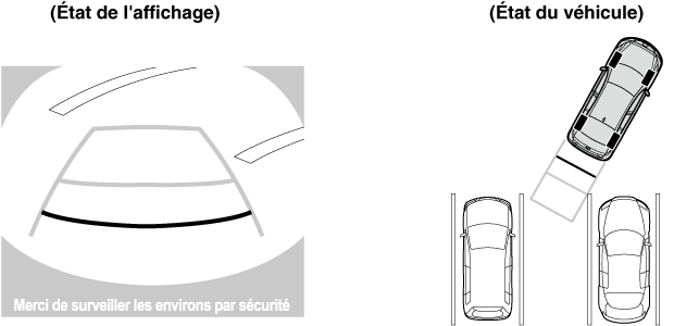 • Comme il peut y avoir une différence entre l'image affichée, comme indiqué ci-dessous, et les conditions réelles du stationnement, s'assurer toujours de la sécurité à l'arrière du véhicule et dans la zone environnante directement avec les yeux.