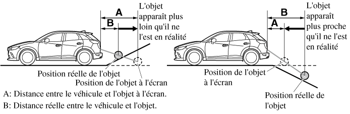 Lorsqu'il y a une pente raide montante (ou descendante) derrière le véhicule, l'objet affiché à l'écran apparaît plus loin (ou plus près en cas de pente descendante) qu'il ne l'est en réalité.