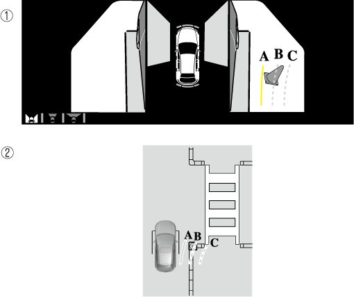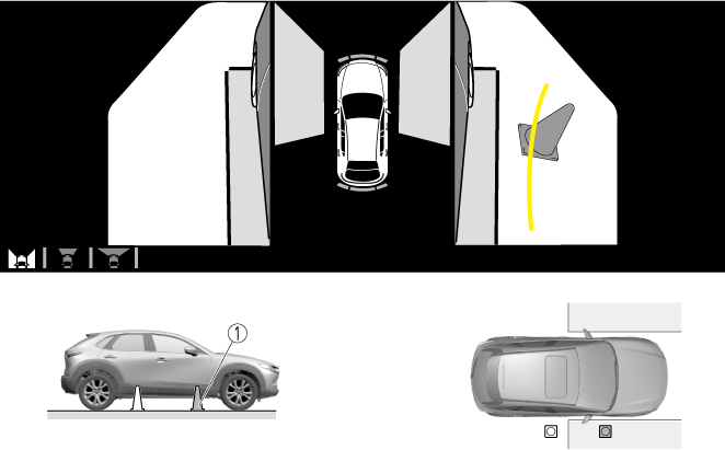 La portée de détection du capteur de stationnement est limitée. Par exemple, les obstructions se rapprochant sur le côté et les objets de faible hauteur peuvent ne pas être détectés. Toujours vérifier visuellement la sécurité du véhicule lors de la conduite.