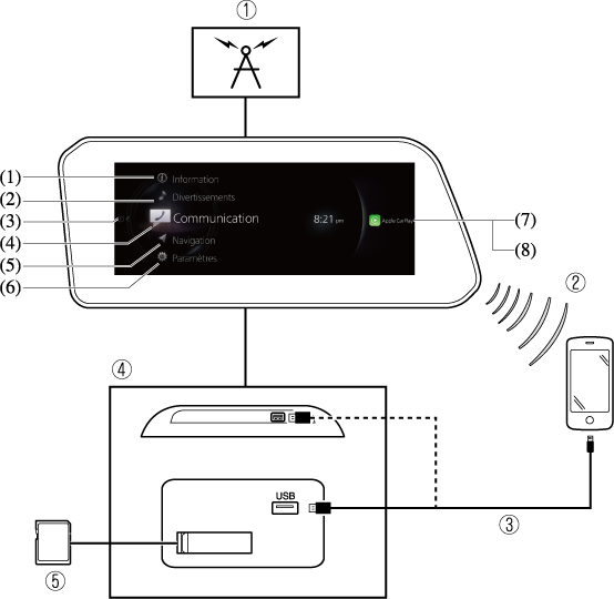 Il est possible d'utiliser Apple CarPlay™ en connectant un iPhone® compatible avec Apple CarPlay™ au port USB. |