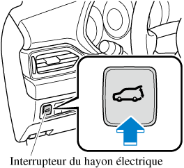 Appuyer sur l'interrupteur du hayon électrique pendant environ une seconde ou plus pendant que le hayon est en position ouverte/fermée complète. Les feux de détresse vont clignoter deux fois et le hayon s'ouvre/se ferme complètement après le bip sonore.