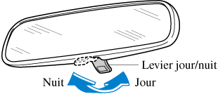 Pousser le levier jour/nuit vers l'avant pour une conduite de jour. Le tirer vers l'arrière pour réduire l'éblouissement causé par les phares des voitures roulant derrière.