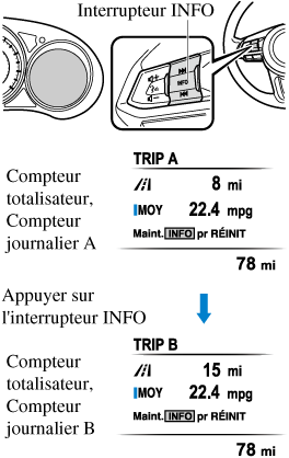 La distance de conduite pour un intervalle spécifié est indiquée. Il est possible de mesurer la distance de deux types d'intervalles (TRIP A, TRIP B) ainsi que l'économie moyenne de carburant pour chacun.