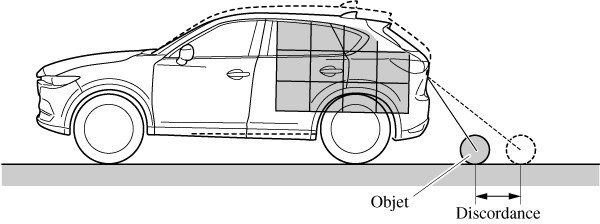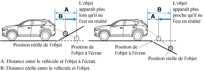 Lorsqu'il y a une pente raide montante (ou descendante) derrière le véhicule, l'objet affiché à l'écran apparaît plus loin (ou plus près en cas de pente descendante) qu'il ne l'est en réalité.