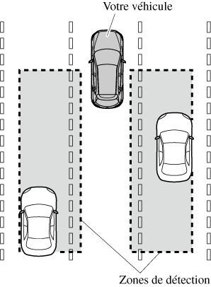 La BSM détecte les véhicules arrivant de l'arrière lorsque le véhicule se déplace vers l'avant à une vitesse de 10 km/h (6,3 mi/h) ou plus et notifie le conducteur en allumant l'indicateur d'avertissement de la BSM et en affichant l'écran de détection de véhicules (véhicules avec tableau de bord (Type A/B) et affichage de conduite active).