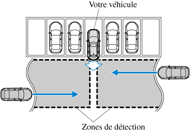 Le système RCTA détecte les véhicules qui s'approchent par les côtés arrière gauche et droit ou par l’arrière du véhicule lorsque le véhicule fait marche arrière à partir d'un espace de stationnement, et avertit le conducteur de danger possible en utilisant les voyants de surveillance des angles morts (BSM) et l'avertisseur sonore.