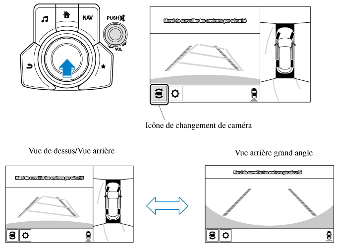 Vous pouvez changer l'écran affiché en appuyant sur le bouton de commande ou en touchant l'icône de changement de caméra sur l'écran lorsque la vue de dessus/vue arrière, vue arrière grand angle est affichée.