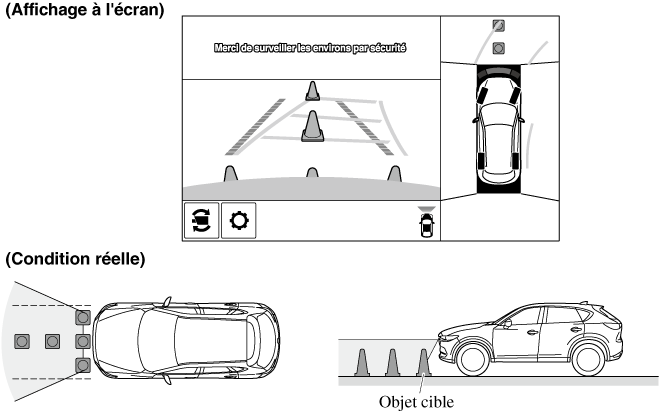 La portée de détection du capteur de stationnement est limitée. Par exemple, les obstructions se rapprochant sur le côté et les objets de faible hauteur peuvent ne pas être détectés. Toujours vérifier visuellement la sécurité du véhicule lors de la conduite.