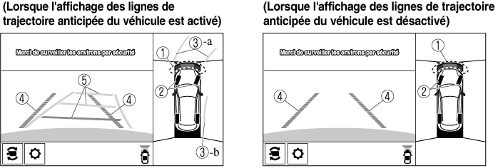 Il est possible de modifier le réglage de manière à masquer les lignes de trajectoire anticipée du véhicule.
