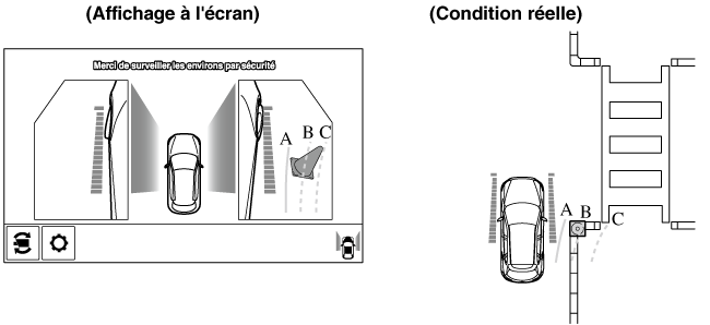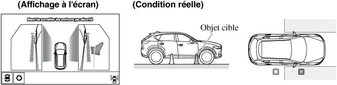 La portée de détection du capteur de stationnement est limitée. Par exemple, les obstructions se rapprochant sur le côté et les objets de faible hauteur peuvent ne pas être détectés. Toujours vérifier visuellement la sécurité du véhicule lors de la conduite.