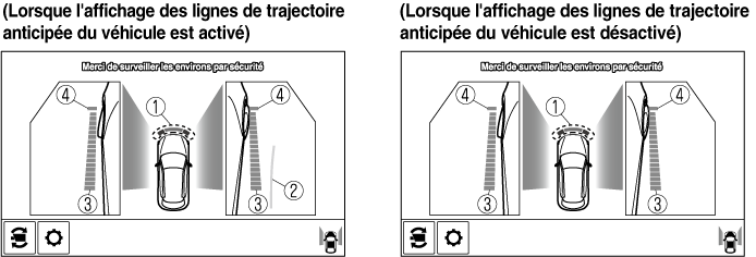 Il est possible de modifier le réglage de manière à masquer les lignes de trajectoire anticipée du véhicule.