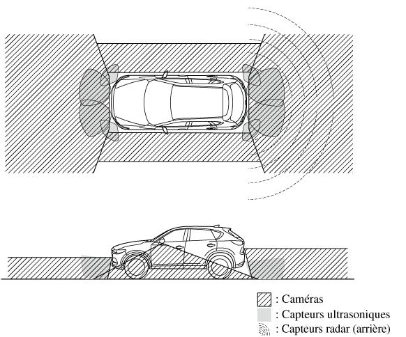 La portée des caméras et la capacité de détection des capteurs sont limitées. Par exemple, les zones en noir à l'avant et à l'arrière de l'image du véhicule et les zones où les images des caméras se rejoignent sont des angles morts pouvant cacher une obstruction. En outre, les lignes de largeur étendues et les lignes de trajectoire anticipée du véhicule doivent uniquement servir de référence, les images à l'écran peuvent différer des conditions réelles.