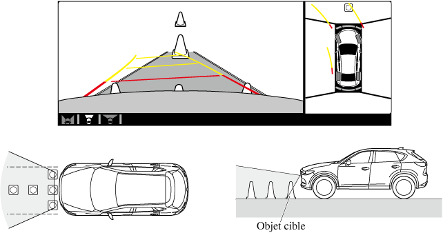 La portée de détection du capteur de stationnement est limitée. Par exemple, les obstructions se rapprochant sur le côté et les objets de faible hauteur peuvent ne pas être détectés. Toujours vérifier visuellement la sécurité du véhicule lors de la conduite.