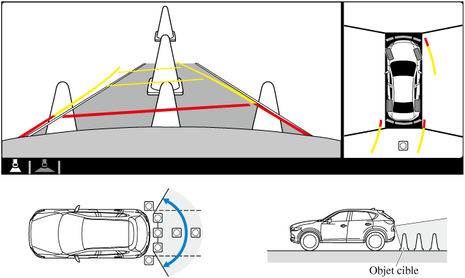 Les obstructions affichées dans la vue arrière peuvent ne pas s'afficher sur l'écran de vue de dessus.