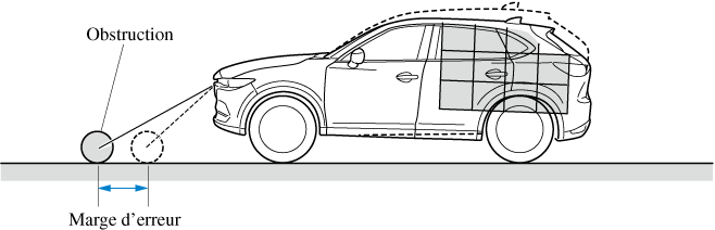 Il peut y avoir une certaine marge d'erreur entre la surface de la route apparaissant à l'écran et la surface réelle de la route. Une marge d'erreur dans la distance perçue pourrait conduire à un accident, soyez donc conscient des conditions suivantes qui peuvent plus facilement produire des erreurs dans la distance perçue.