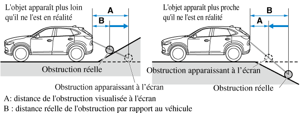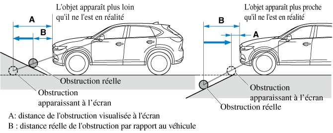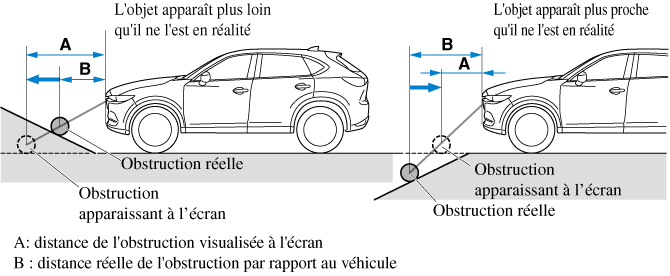 Si la route monte ou descend de manière abrupte à l'avant ou à l'arrière du véhicule, les obstructions détectées par la caméra peuvent sembler plus éloignées ou plus proches qu’elles ne le sont réellement.