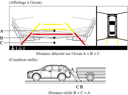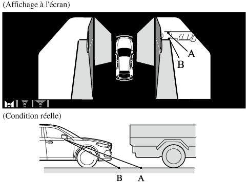 Étant donné que les lignes de guidage d’extrémité avant du véhicule ou les lignes de guidage de distance (caméra arrière) sont affichées sur la base d'une surface plane, la distance à l'objet en trois dimensions affichée sur l'écran est différente de la distance réelle.