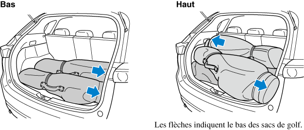 Haut : Placer le troisième sac de golf avec le bas orienté vers la gauche et le quatrième sac de golf avec le bas orienté vers la droite dans le compartiment à bagages.