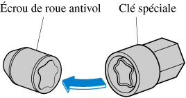 Placer la clé à écrou de roue sur la clé spéciale et appliquer une pression. Tourner la clé dans le sens contraire des aiguilles d'une montre pour retirer l'écrou.