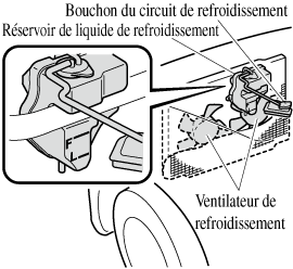 Stationner le véhicule dans un endroit sûr, puis couper le contact et s'assurer que le ventilateur ne tourne pas avant d'entreprendre des travaux à proximité du ventilateur de refroidissement :
