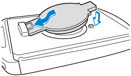 Retirez le couvercle inférieur tout en appuyant sur le bouton dans le sens de la flèche.