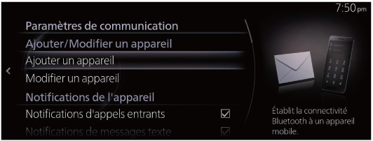 Vous pouvez modifier l'appareil Bluetooth® connecté. Se référer à Paramètres de connectivité (Rechercher). |
