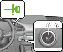 Si l’indication d'avertissement KEY (rouge) est affichée ou que le témoin du bouton de démarrage du moteur (ambre) clignote, il est possible que le moteur ne puisse démarrer en utilisant la méthode de démarrage usuelle (Rechercher). Faire inspecter le véhicule par un concessionnaire agréé Mazda dès que possible. Le moteur peut alors être démarré de force. Maintenir enfoncé le bouton de démarrage du moteur jusqu'au démarrage du moteur. D'autres procédures de démarrage du moteur, telles que la présence de la clé dans la cabine et l'activation de la pédale d'embrayage (boîte de vitesses manuelle) ou la pédale de frein (boîte de vitesses automatique), doivent être respectées.