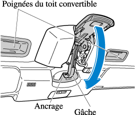 Le toit convertible risquera d'être comprimé si on le laisse rétracté pendant une longue période. Par conséquent, si la capote a été comprimée, il pourra être difficile d'accrocher la gâche pour la gâche supérieure à l'ancrage.