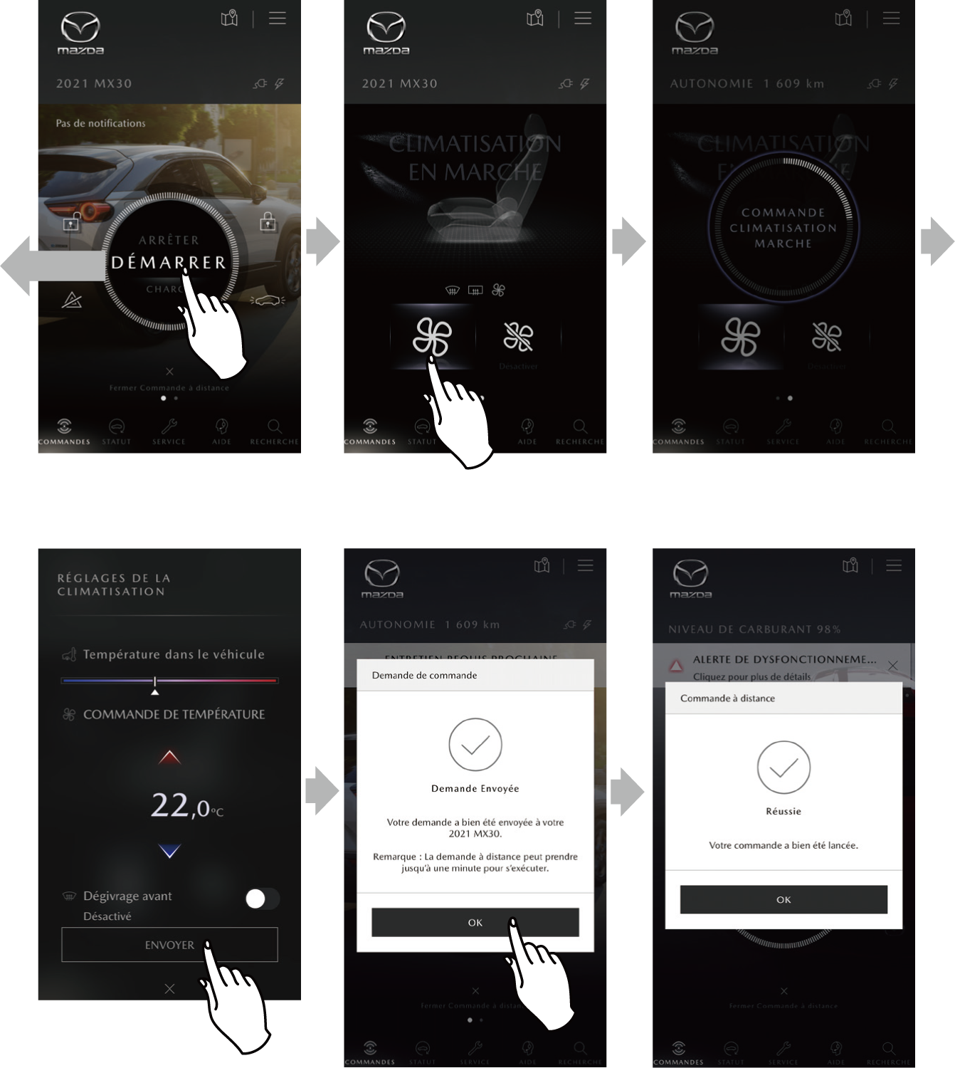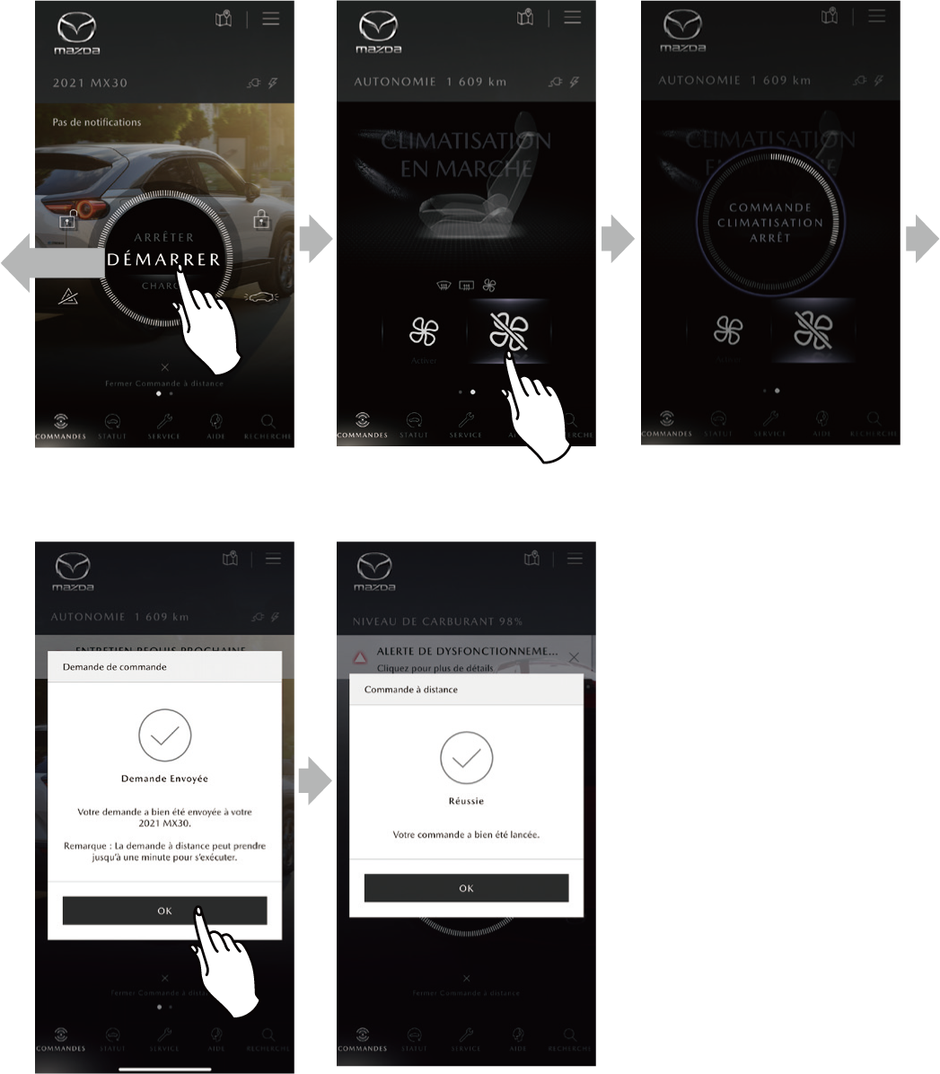 • Même si la transmission d'une demande est réussie, une erreur peut se produire lors de l'exécution de l'opération du côté du véhicule en raison d'une cause telle qu'une portière laissée ouverte. Si une erreur se produit, un message contextuel s'affiche.