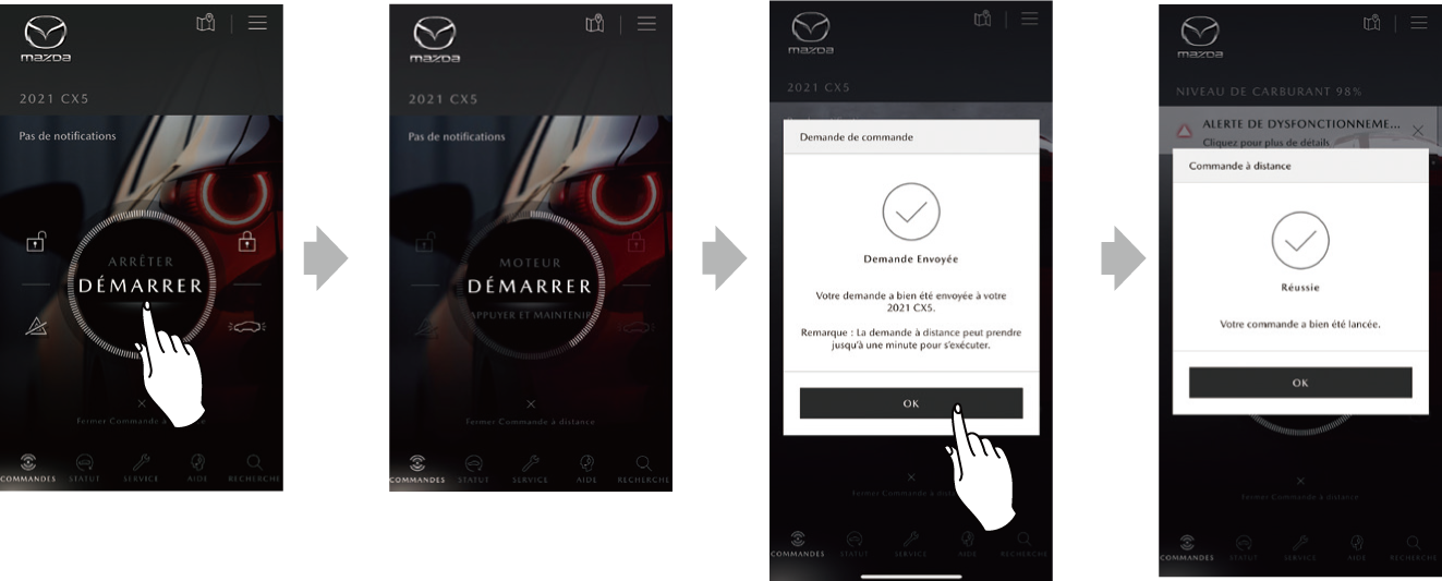 -Une demande d'arrêt du moteur est effectuée à l'aide de la fonction de Démarrage du moteur à distance.