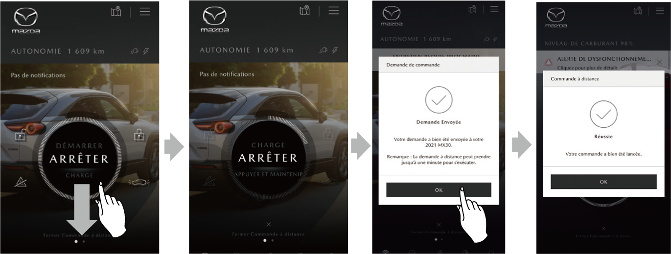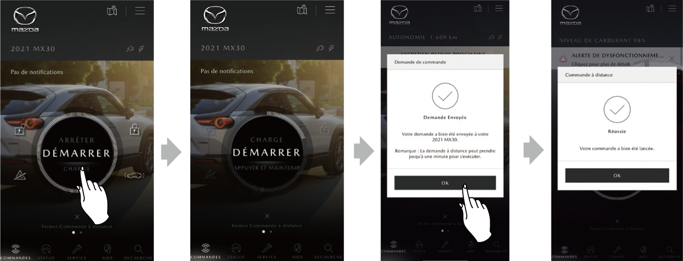 • Une fois que votre véhicule est prêt à être chargé, vous pouvez commencer à charger la batterie à l'aide de la commande de charge à distance.