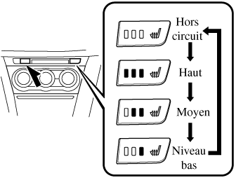 Si le contacteur est mis sur la position d'arrêt pendant que le chauffage de siège fonctionne (Haut, Moyen ou Bas), puis qu'il est mis à nouveau sur ON, le chauffage de siège fonctionnera automatiquement à la température qui était réglée avant que le contacteur ait été mis sur la position d'arrêt.