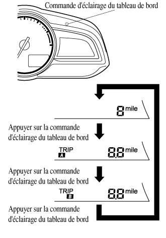 Lorsque le compteur journalier A est sélectionné, si l'on appuie sur la commande d'éclairage du tableau de bord de nouveau à moins d'une seconde cela changera l'affichage au compteur journalier B.