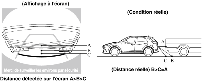 Lorsque l'arrière du véhicule est abaissé, l'objet affiché à l'écran apparaît plus loin qu'il ne l'est en réalité.