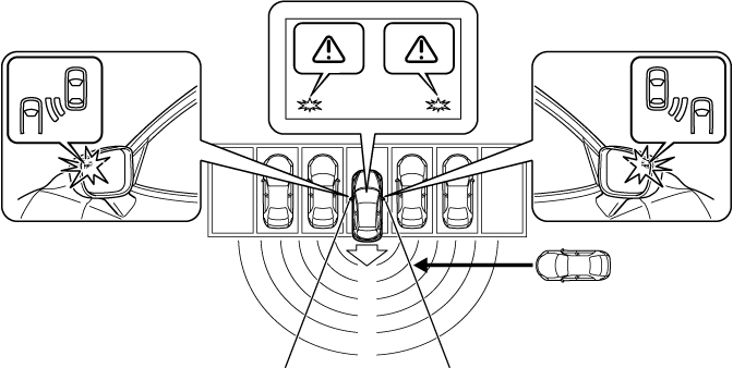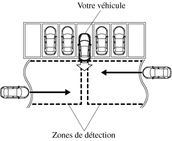 Le système RCTA détecte les véhicules qui s'approchent par les côtés arrière gauche et droit ou par l’arrière du véhicule lorsque le véhicule fait marche arrière à partir d'un espace de stationnement, et avertit le conducteur de danger possible en utilisant les voyants de surveillance des angles morts (BSM) et l'avertisseur sonore.