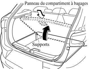 Tirer un peu le panneau du compartiment à bagages et insérer le bord opposé dans les supports de façon à ce que le panneau du compartiment à bagages soit soutenu.