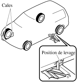Lorsque le véhicule est monté sur un cric, toujours passer le levier de vitesses de la 1re à la marche arrière (véhicule à boîte de vitesses manuelle) ou placer le levier sélecteur sur P (véhicule à boîte de vitesses automatique), serrer le frein de stationnement et placer des cales de roue à la position diagonalement opposée au cric :