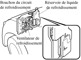 Si le ventilateur de refroidissement ne fonctionne pas lorsque le moteur tourne, la température du moteur augmentera. Arrêter le moteur et faire appel à un concessionnaire agréé Mazda.
