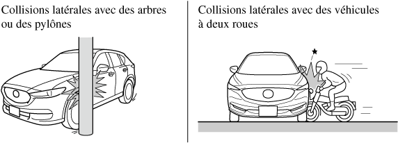 Les illustrations suivantes sont des exemples de collisions latérales qui sont susceptibles de ne pas être détectées comme assez sévères pour justifier le déploiement de l'équipement de coussin d'air SRS.