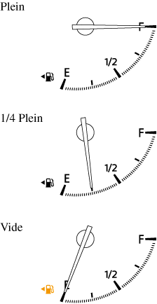 Après qu'on ait refait le plein de carburant, un certain temps pourra être nécessaire avant que l'indicateur se stabilise. En outre, il est possible que l'indicateur dévie lors de la conduite sur une pente ou dans un virage, en raison des mouvements du carburant à l'intérieur du réservoir.