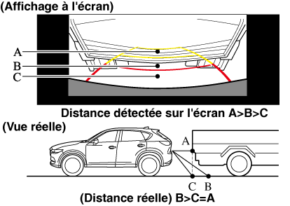 Lorsque l'arrière du véhicule est abaissé, l'objet affiché à l'écran apparaît plus loin qu'il ne l'est en réalité.