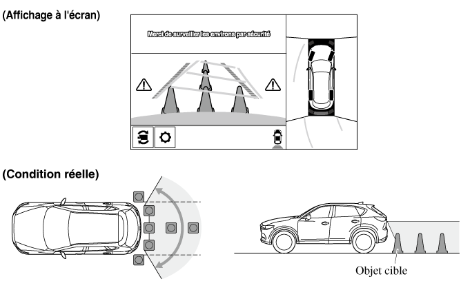 • La portée de détection du capteur de stationnement est limitée. Par exemple, les obstructions se rapprochant sur le côté et les objets de faible hauteur peuvent ne pas être détectés. Toujours vérifier visuellement la sécurité du véhicule lors de la conduite.