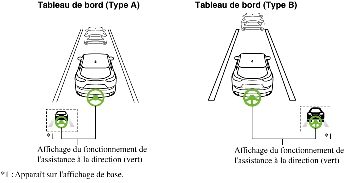 Il est possible de consulter l'affichage multi-informations pour vérifier si l'assistance à la direction effectue des contrôles en liaison avec les lignes de voie de circulation ou un véhicule devant.