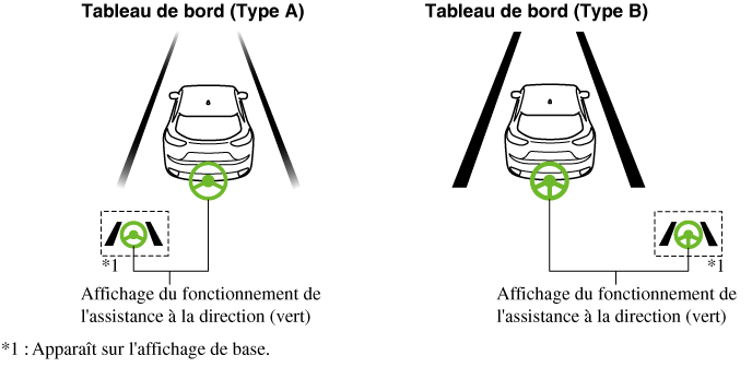 Lorsque la fonction d'assistance à la direction est activée, l'affichage de l'assistance à la direction sur l'écran passe du blanc au vert.