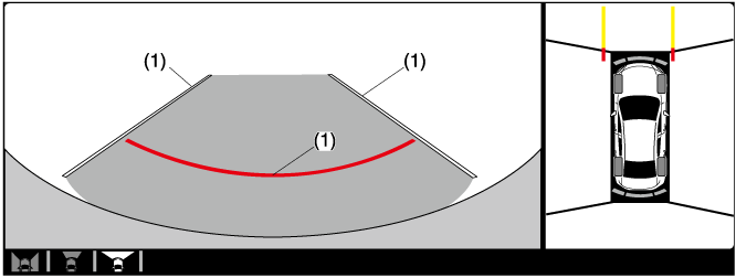 Lignes de largeur étendues du véhicule et lignes de guidage de distance (bleues et rouges)