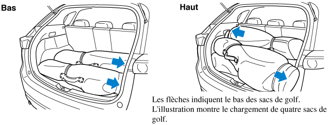 Haut : Placer le troisième sac de golf avec le bas orienté vers la gauche et le quatrième sac de golf avec le bas orienté vers la droite dans le compartiment à bagages.