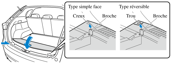 Insérer les creux ou les trous gauche et droit du panneau du compartiment à bagages arrière dans les goupilles.