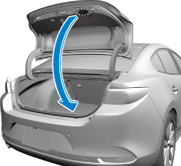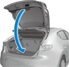 Abaisser doucement le hayon/couvercle du coffre en utilisant la cavité de poignée du hayon/couvercle du coffre, puis pousser le hayon/couvercle du coffre avec les deux mains pour le fermer.