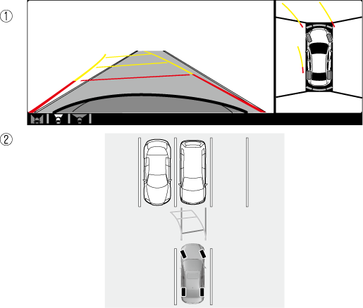 Utilisez la vue de dessus/vue avant pour vous aider à vérifier la sécurité de la zone environnante lors du démarrage, du stationnement ou de l'arrêt du véhicule.