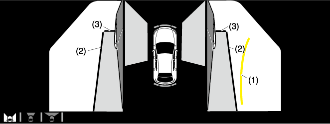 Indique approximativement la trajectoire anticipée du véhicule. Se déplace en même temps que le volant. Les lignes de trajectoire anticipée du véhicule (jaune) indiquent la trajectoire que devrait suivre le côté intérieur du véhicule. |